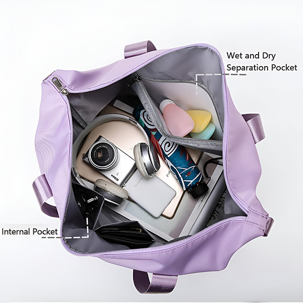 Esta bolsa cuenta con un divisor húmedo y seco para guardar cómodamente la ropa sucia o húmeda y las toallas.